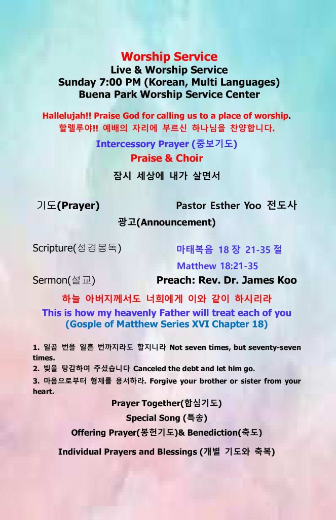 4. 매주일 현장 예배가 Buena Park Center에서 7시에 시작됩니다. 먼저 예배 전 간단한 간식을 준비됩니다.