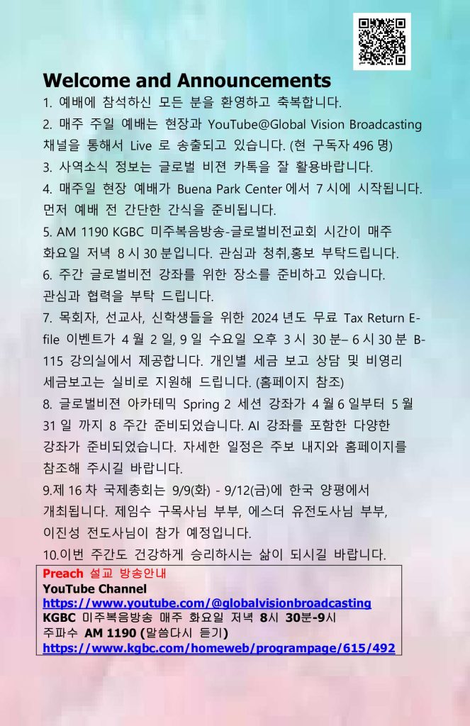 Preach 설교 방송안내 YouTube Channel https://www.youtube.com/@globalvisionbroadcasting