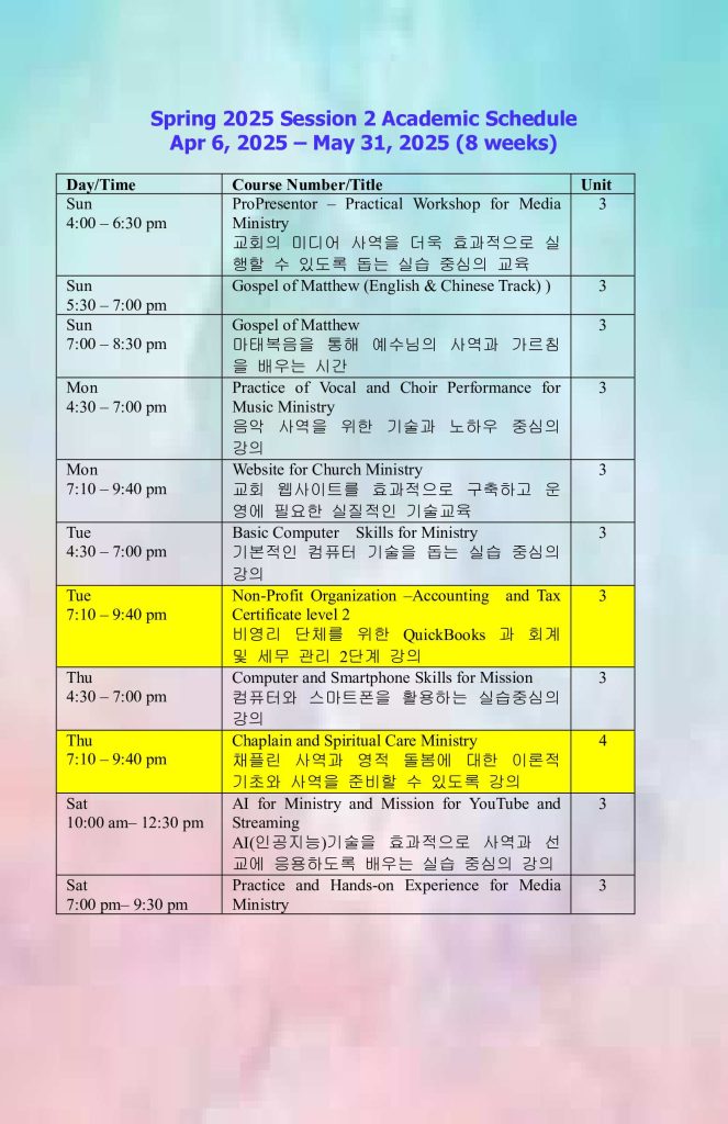 8. 글로벌비젼 아카테믹 Spring 2 세션 강좌가 4월6일부터 5월 31일 까지 8 주간 준비되었습니다. AI 강좌를 포함한 다양한 강좌가 준비되었습니다. 자세한 일정은 주보 내지와 홈페이지를 참조해 주시길 바랍니다.