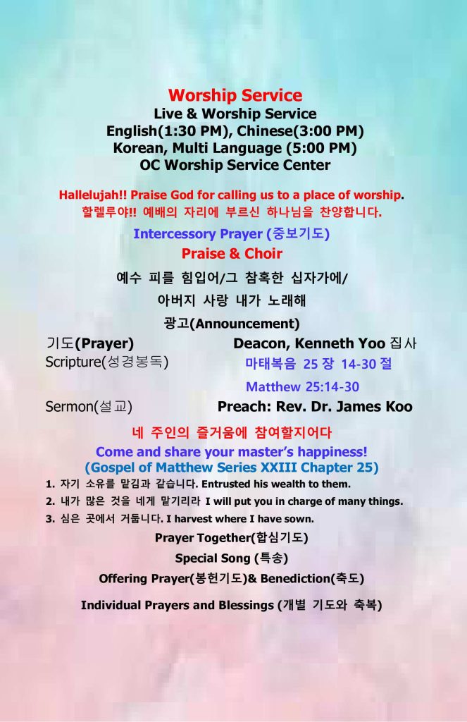 4..이번주부터 현장 예배시간이 주일 오후 5시에 OC Worship Service Center 에서 드립니다. English 및 Chinese 예배가 6월부터 현장과 Live로 준비될 예정입니다.