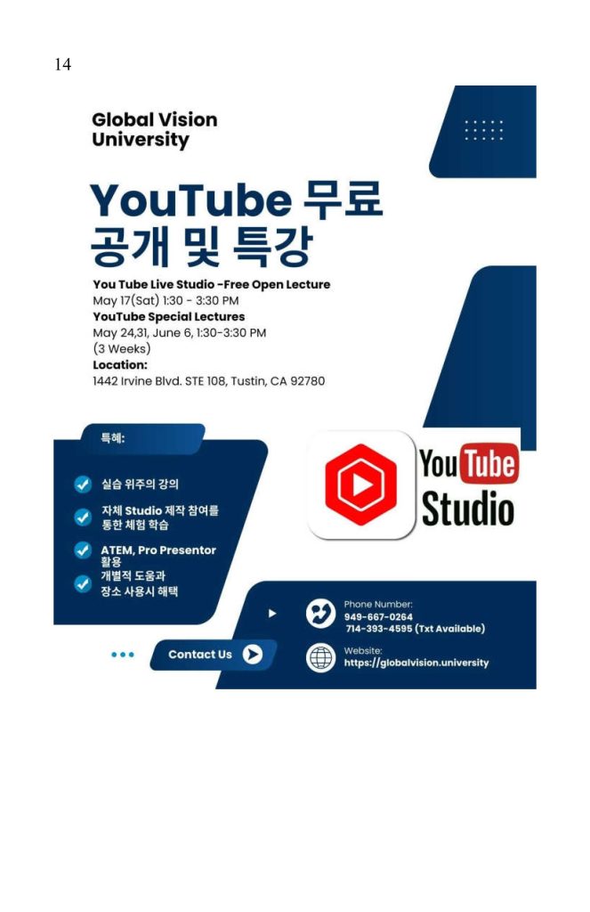 7. 5월 17일 토요일 1시30분에 무료 공개 –초보자를 위한 YouTube 방송 제작 오픈 강좌가 열리고 이후 3주간YouTube Studio 활용 특별 강좌가 매주 토요일 1시 30분부터 4시까지 열립니다. 또한 YouTube Live Studio사용 신청을 받고 있습니다.