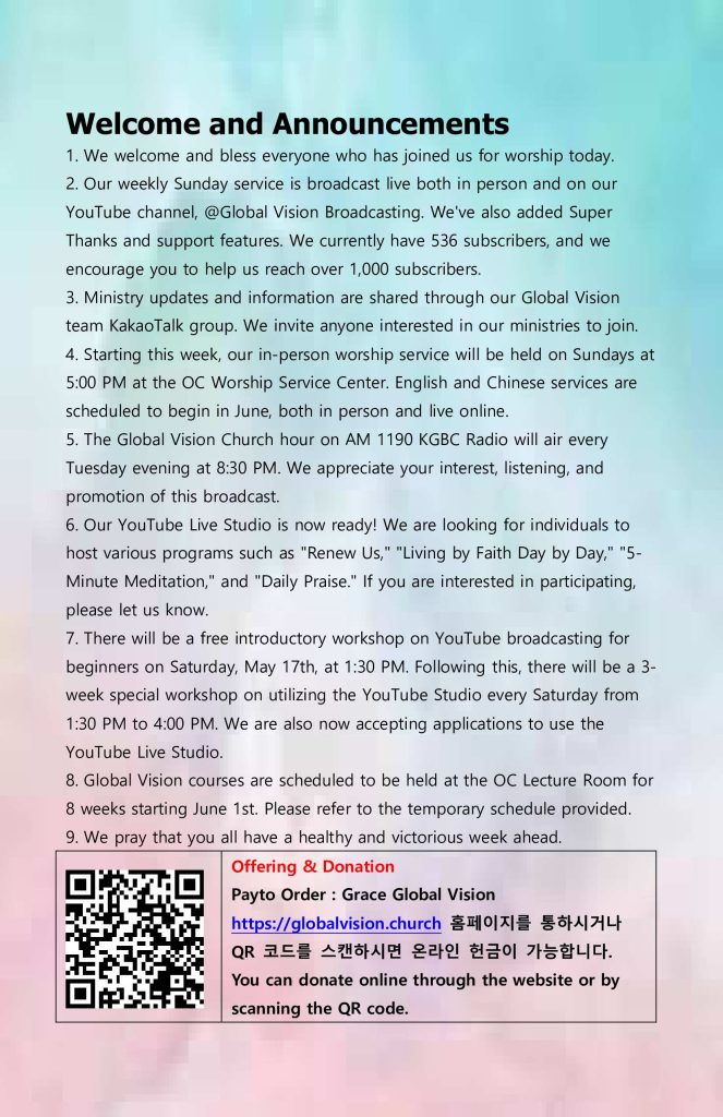 2. 매주 주일 예배는 현장과 YouTube@Global Vision Broadcasting 채널을 통해서 Live 로 송출되며 Super Thanks 및 후원 기능이 추가 되었습니다. 현재 구독자수가 536명로 1000명 이상의 구독자가 참여하도록 알려 주시길 바랍니다.