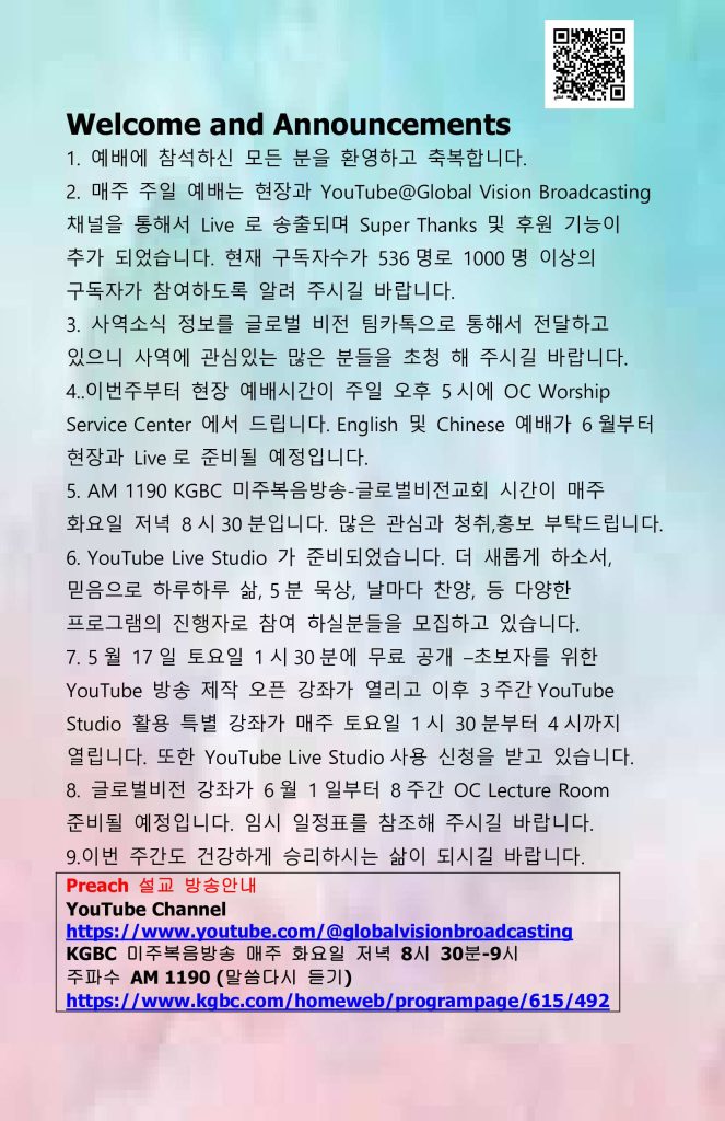 Preach 설교 방송안내 YouTube Channel https://www.youtube.com/@globalvisionbroadcasting KGBC 미주복음방송 매주 화요일 저녁 8시 30분-9시 주파수 AM 1190 (말씀다시 듣기) https://www.kgbc.com/homeweb/programpage/615/492