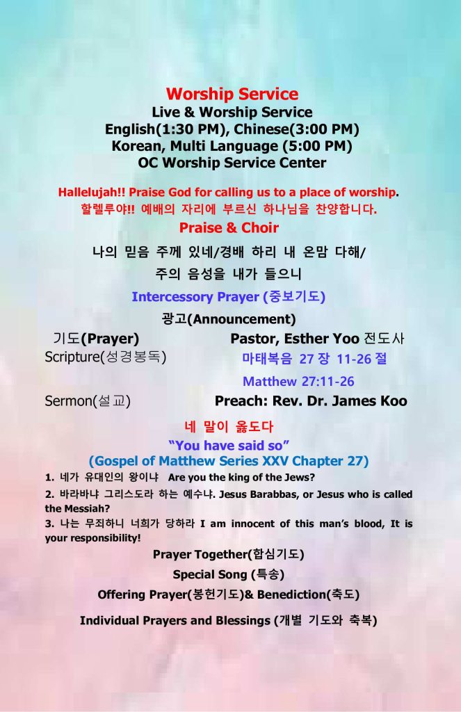 5. 매주 현장 예배시간이 주일 오후 5시에 OC Worship Service Center 에서 드립니다.