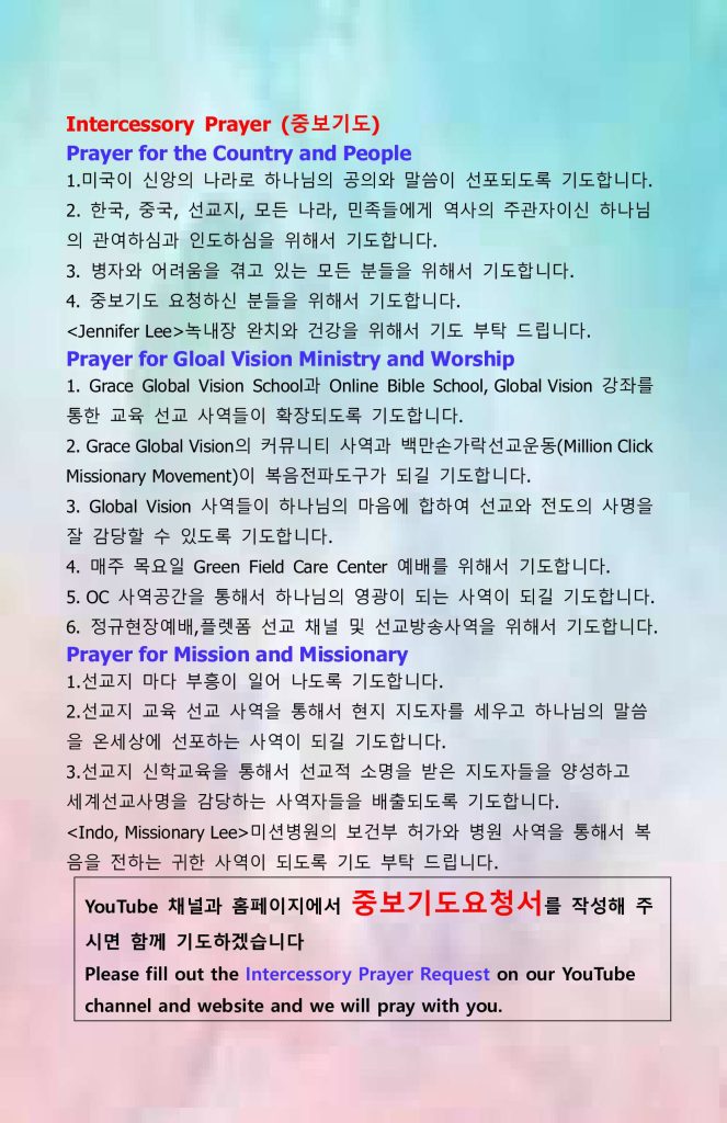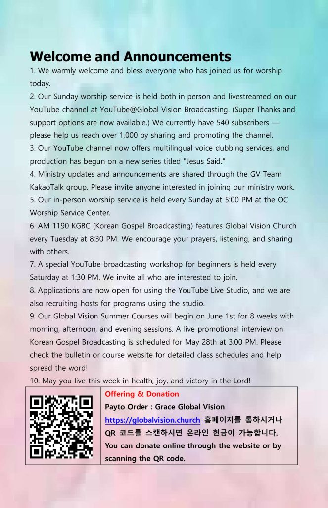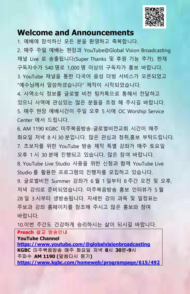 2. 매주 주일 예배는 현장과 YouTube@Global Vision Broadcasting 채널 Live 로 송출됩니다(Super Thanks 및 후원 기능 추가). 현재 구독자수가 540명로 1,000명 이상의 구독자가 홍보 바랍니다.