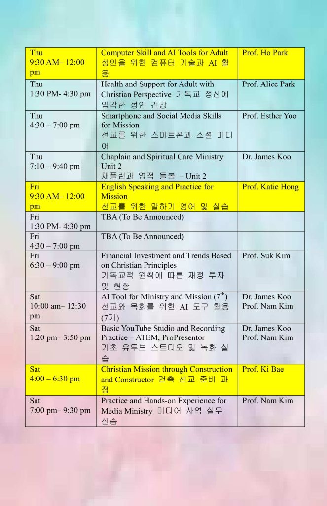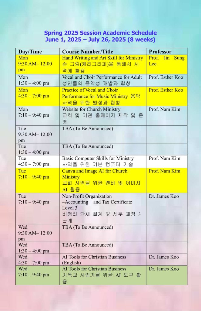 9. Our Global Vision Summer Courses will begin on June 1st for 8 weeks with morning, afternoon, and evening sessions. A live promotional interview on Korean Gospel Broadcasting is scheduled for May 28th at 3:00 PM. Please check the bulletin or course website for detailed class schedules and help spread the word!