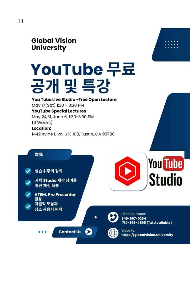 7. 초보자를 위한 YouTube 방송 제작 특별 강좌가 매주 토요일 오후 1시 30분에 진행되고 있습니다. 많은 참여 바랍니다.