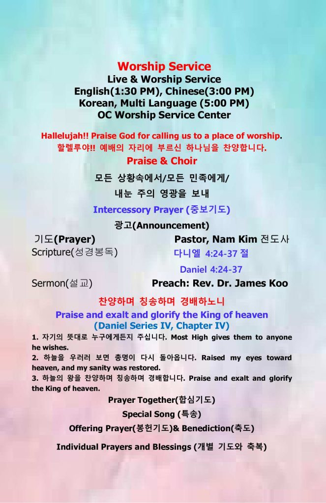 4. 매주 현장 예배는 주일 오후 5시에 OC Worship Service Center