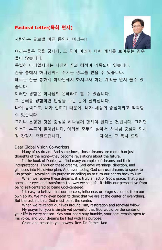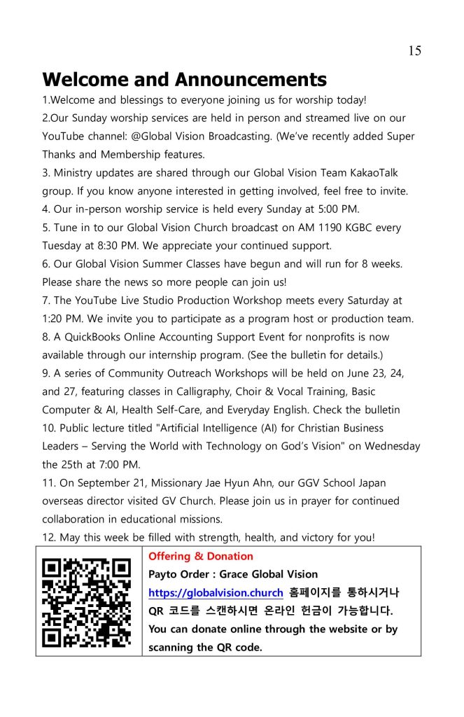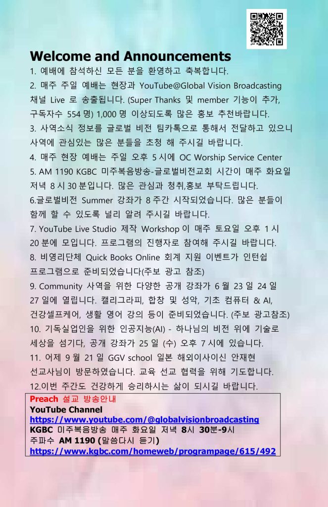 2. 매주 주일 예배는 현장과 YouTube@Global Vision Broadcasting 채널 Live 로 송출됩니다. (Super Thanks 및 member 기능이 추가, 구독자수 554명) 1,000명 이상되도록 많은 홍보 추천바랍니다.