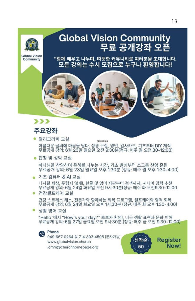 9. Community 사역을 위한 다양한 공개 강좌가 6월 23일 24일 27일에 열립니다. 캘리그라피, 합창 및 성악, 기초 컴퓨터 & AI, 건강셀프케어, 생활 영어 강의 등이 준비되었습니다. (주보 광고참조)