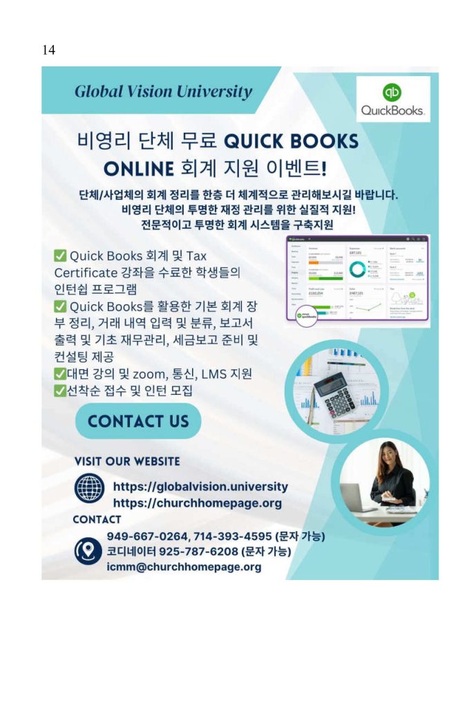 8. 비영리단체 Quick Books Online 회계 지원 이벤트가 인턴쉽 프로그램으로 준비되었습니다(주보 광고 참조)
