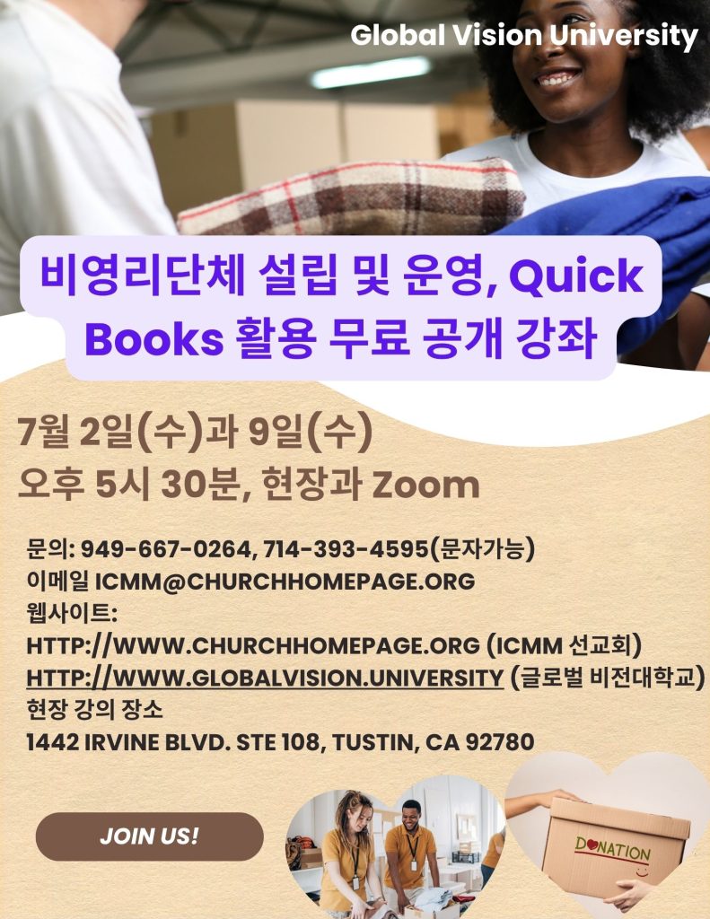 비영리 단체 설립 및 운영, Quick Books 활용 무료 공개 강의가 Information Center for Mission and Ministry (ICMM, 선교와 목회를 위한 정보센터)와 Global Vision University 주관으로 7월 2일(수) 및 9일(수) 오후5시30분 오랜지 카운티 OC 강의실에서 현장과 Zoom 으로 진행된다.