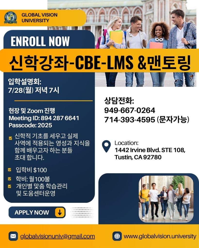 글로벌비전 신학강좌가 가을 학기부터 CBE-LMS, 맨토링교육으로 진행됩니다. 7월 23일(수) 2시30분 미주복음방송 인터뷰가 진행되며 입학 설명회가 7월 28일(월) 7시에 OC 교육장에서 개최됩니다.