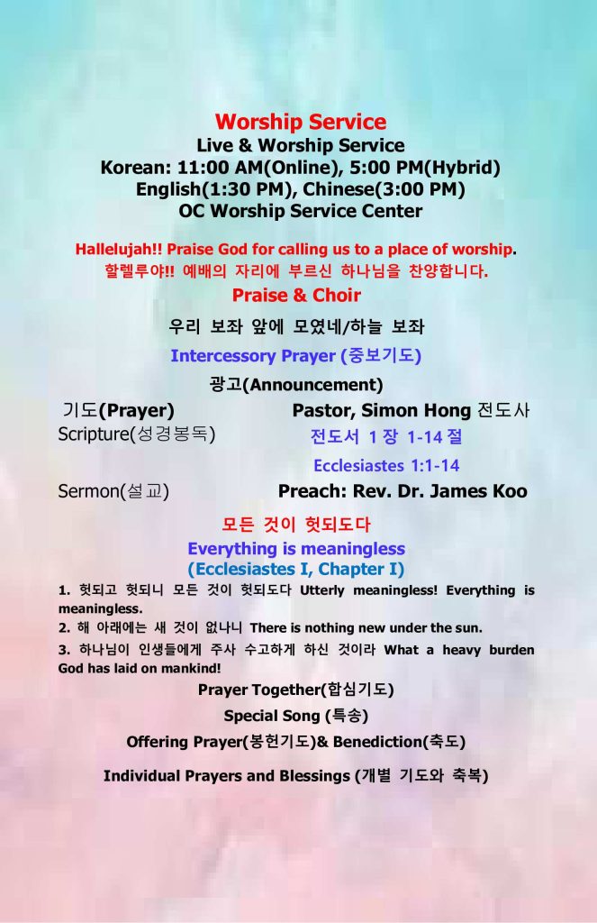 4. Sunday worship services are held online at 11:00 AM in Korean and 1:30 PM in English. The weekly on-site worship service takes place at 5:00 PM.