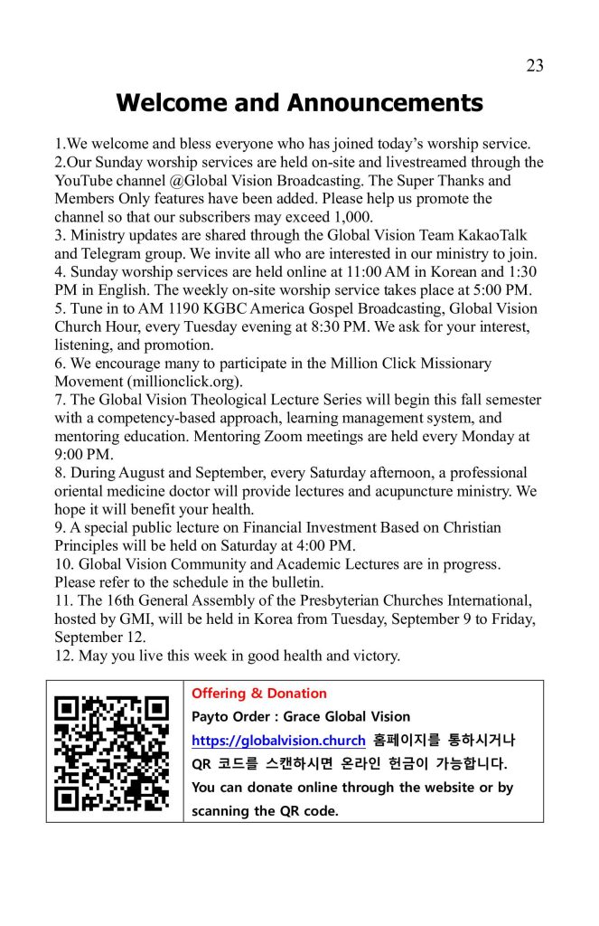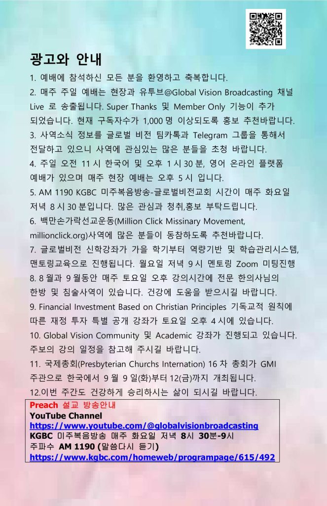 2. 매주 주일 예배는 현장과 유투브@Global Vision Broadcasting 채널 Live 로 송출됩니다. Super Thanks 및 Member Only 기능이 추가 되었습니다. 현재 구독자수가 1,000명 이상되도록 홍보 추천바랍니다.