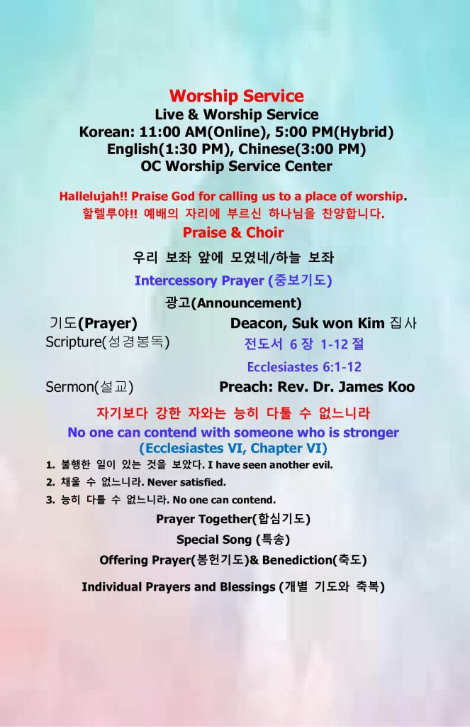 4. Worship Schedule. Korean Online Service: Sundays at 11:00 AM, English Online Service: Sundays at 1:30 PM, On-site Service: Sundays at 5:00 PM