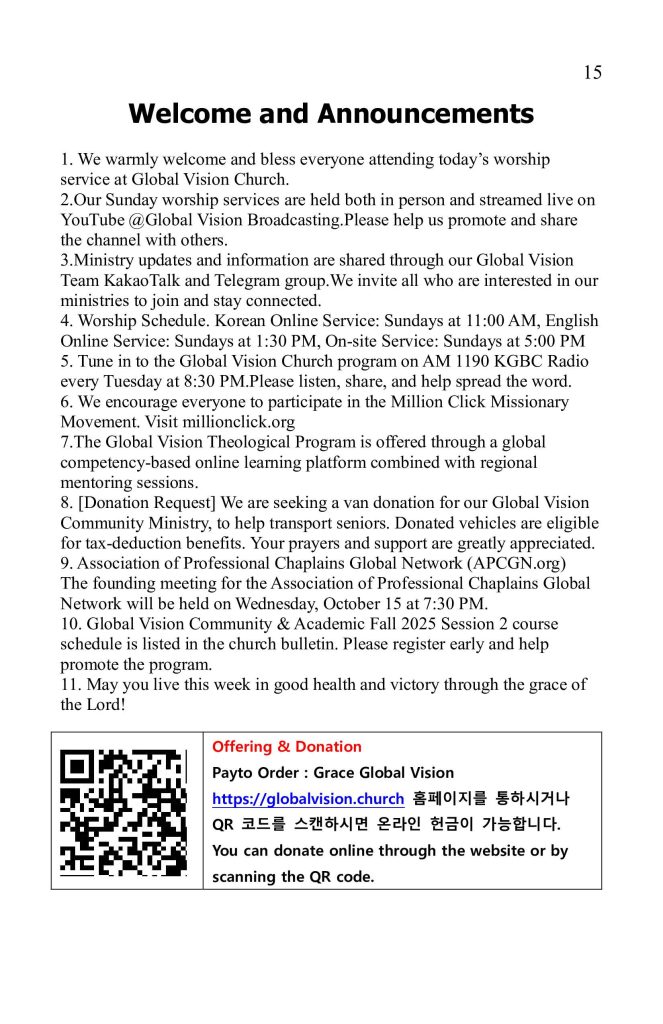 10. Global Vision Community & Academic Fall 2025 Session 2 course schedule is listed in the church bulletin. Please register early and help promote the program.