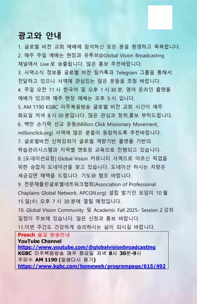 2. 매주 주일 예배는 현장과 유투브@Global Vision Broadcasting 채널에서 Live로 송출됩니다. 많은 홍보 추천바랍니다.