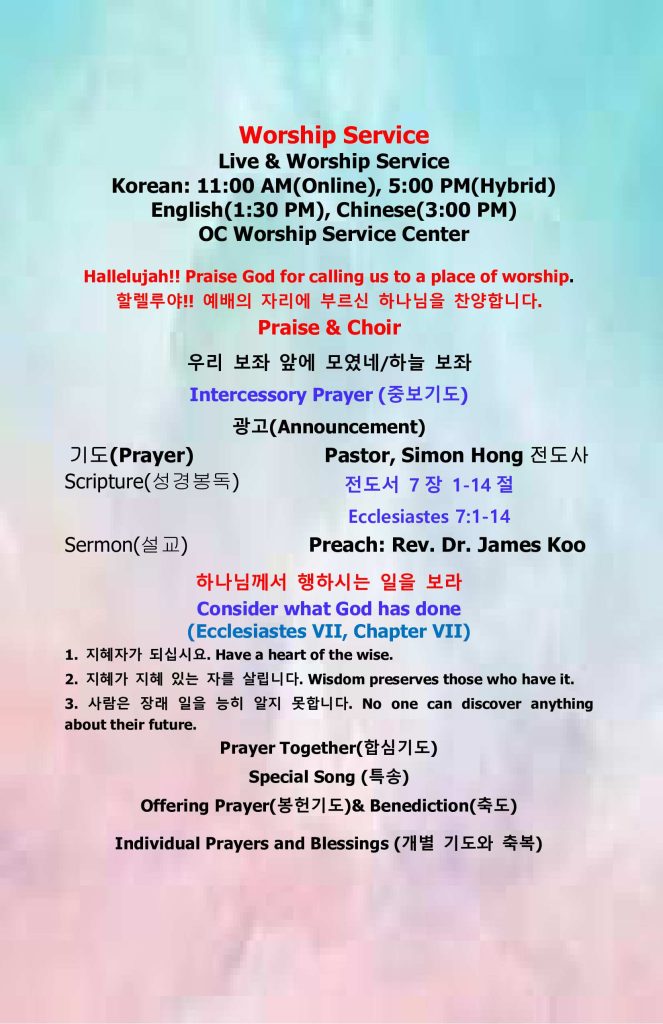 4. Worship Schedule, Korean Worship: Sunday at 11:00 AM (Online & On-site), English Worship: Sunday at 1:30 PM (Online), Evening On-site Worship: Sunday at 5:00 PM