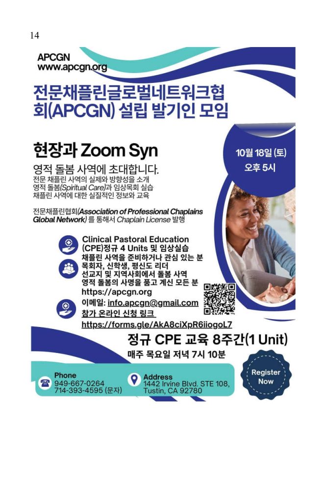 9. 전문채플린글로벌네트워크협회(Association of Professional Chaplains Global Network, APCGN.org) 설립 발기인 모임이 10월 18일(토) 오후 5시에 현장과 Zoom 으로 개최됩니다. 미주복음방송 인터뷰를 16일(목) 오후3시 예정입니다.
