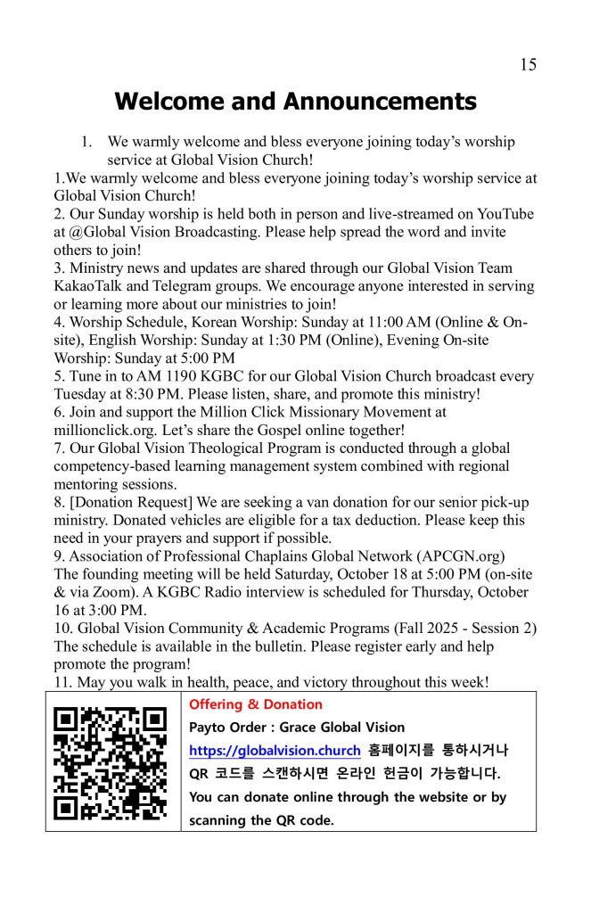1. 글로벌 비전 교회 예배에 참석하신 모든 분을 환영하고 축복합니다.
