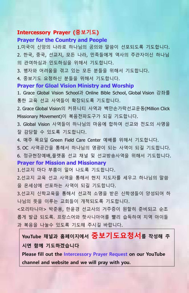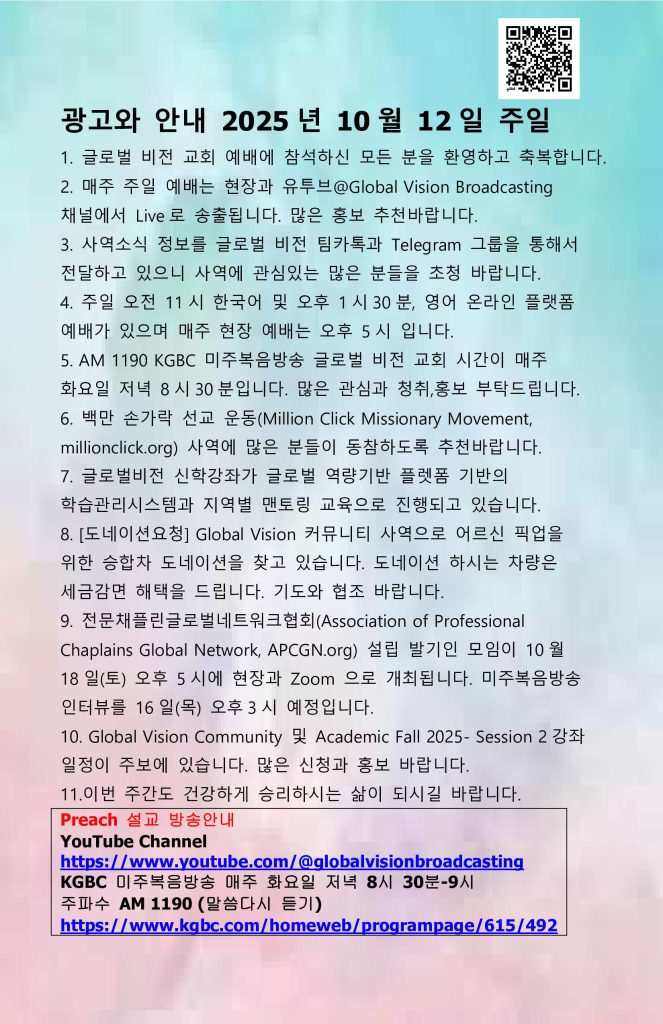 2. 매주 주일 예배는 현장과 유투브@Global Vision Broadcasting 채널에서 Live로 송출됩니다. 많은 홍보 추천바랍니다.