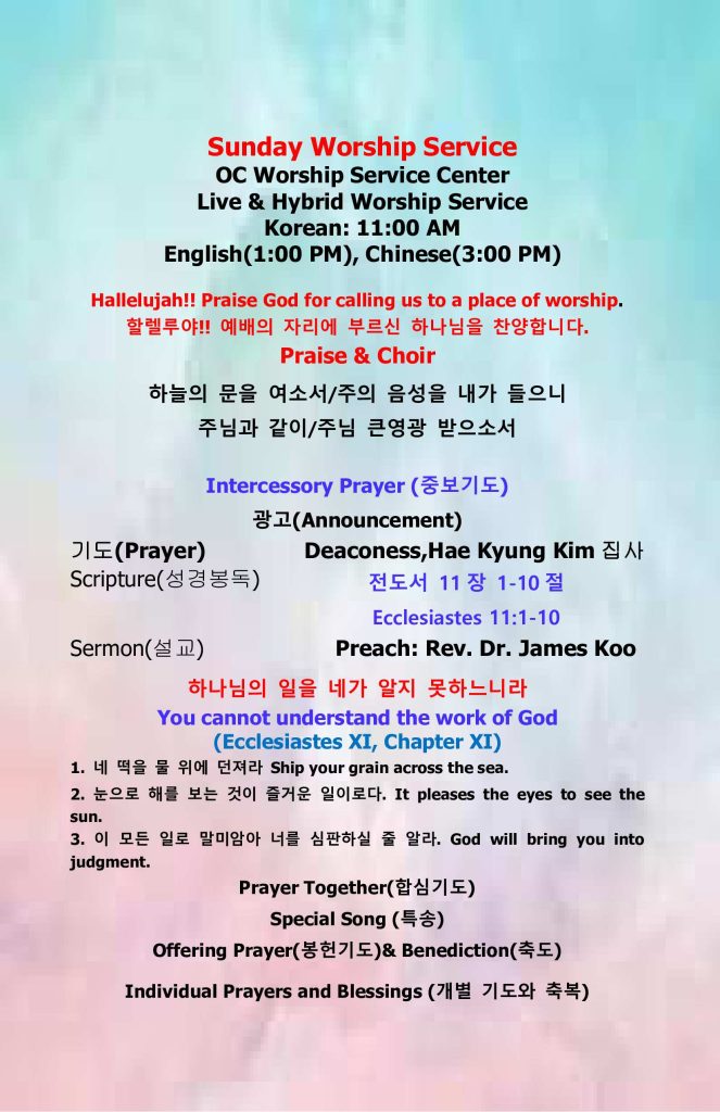 4. 이번주부터 매주일 현장 예배시간이 오전 11시에 시작됩니다. 영어  온라인 플랫폼 예배는 1시에 진행되며 많은 분들이 참석할 수 있도록 안내해 주시길 바랍니다.
