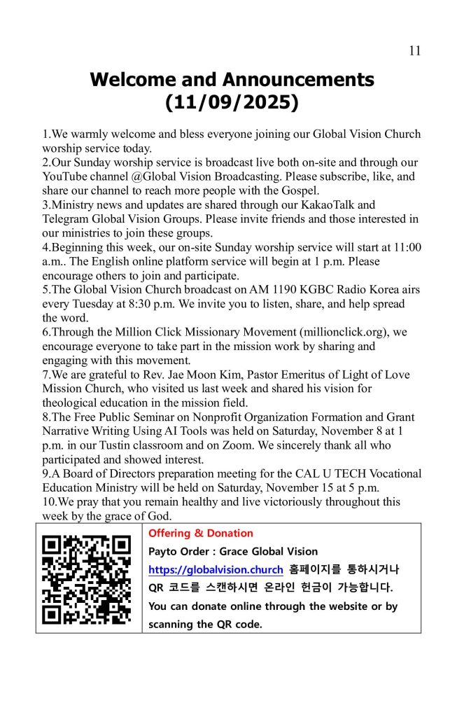 1. 글로벌 비전 교회 예배에 참석하신 모든 분을 환영하고 축복합니다.