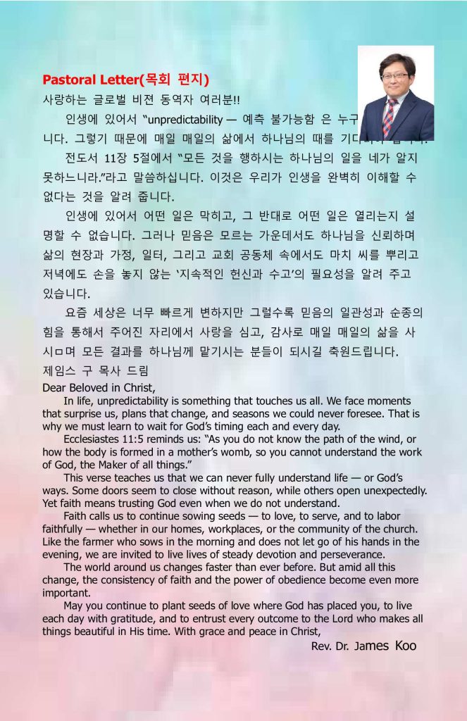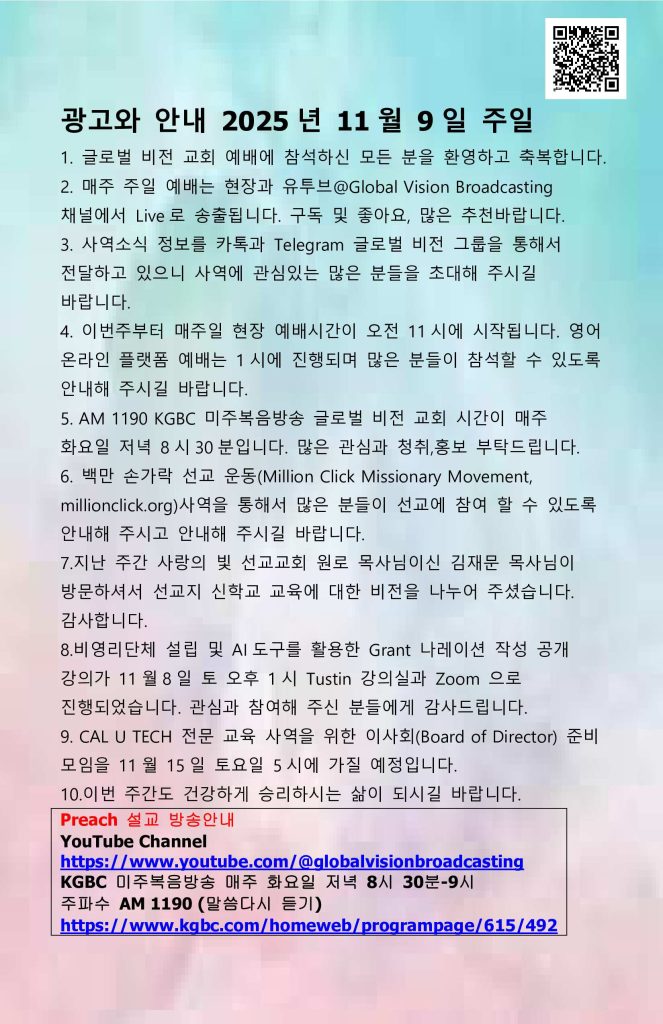 2. 매주 주일 예배는 현장과 유투브@Global Vision Broadcasting 채널에서 Live로 송출됩니다. 구독 및 좋아요, 많은 추천바랍니다.