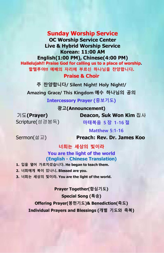 4. 매주일 현장 예배시간이 오전 11시에 시작됩니다. 영어 및 중국어 플랫폼 예배에 관심을 가지고 참여해 주시길 바랍니다.