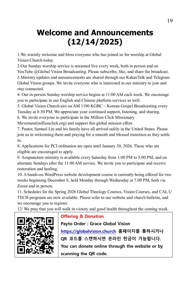 11. Schedules for the Spring 2026 Global Theology Courses, Vision Courses, and CAL U TECH programs are now available. Please refer to our website and church bulletin, and we encourage you to register.