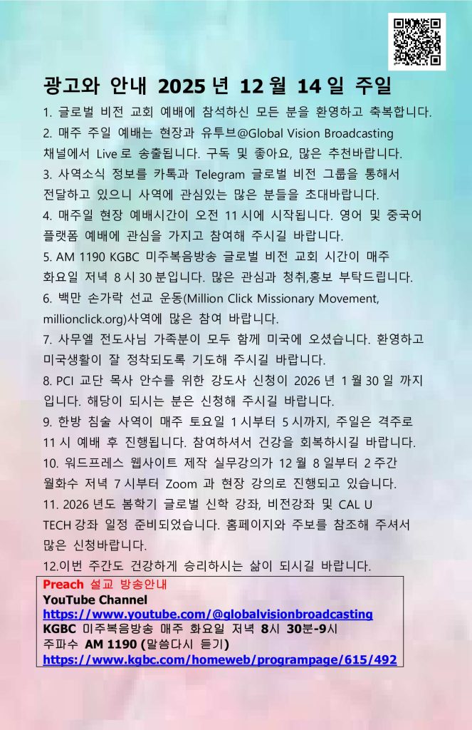 | Preach 설교 방송안내 YouTube Channel https://www.youtube.com/@globalvisionbroadcasting KGBC 미주복음방송 매주 화요일 저녁 8시 30분-9시 주파수 AM 1190 (말씀다시 듣기) https://www.kgbc.com/homeweb/programpage/615/492 |