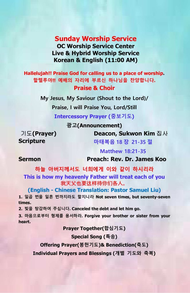 - Every Sunday, the 11:00 AM in-person worship service is conducted as a simultaneous interpretation service. After the service, there will be fellowship time, and we kindly encourage everyone to participate.