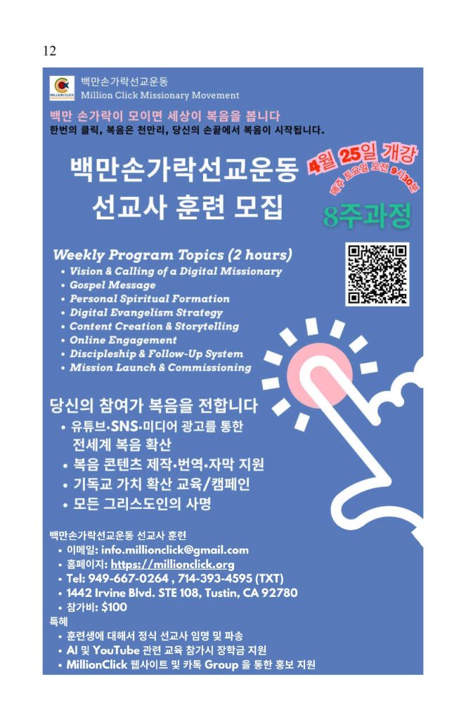 6. 백만 손가락 선교 운동(Million Click Missionary Movement, millionclick.org) 선교사 훈련과정이 4월 25일 토요일부터 8주간 현장과 Zoom 강의로 진행됩니다. 미주복음방송 인터뷰가 24일 금요일 오전 10시 30분에 생방송됩니다. 관심과 많은 신청 바랍니다.