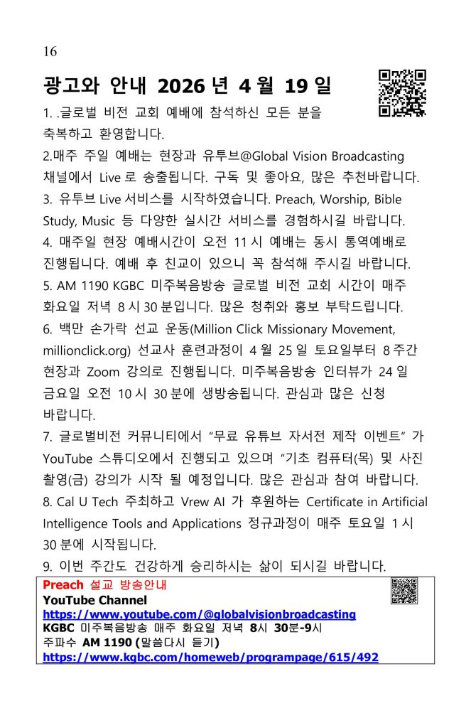 5. AM 1190 KGBC 미주복음방송 글로벌 비전 교회 시간이 매주 화요일 저녁 8시30분입니다. 많은 청취와 홍보 부탁드립니다.
