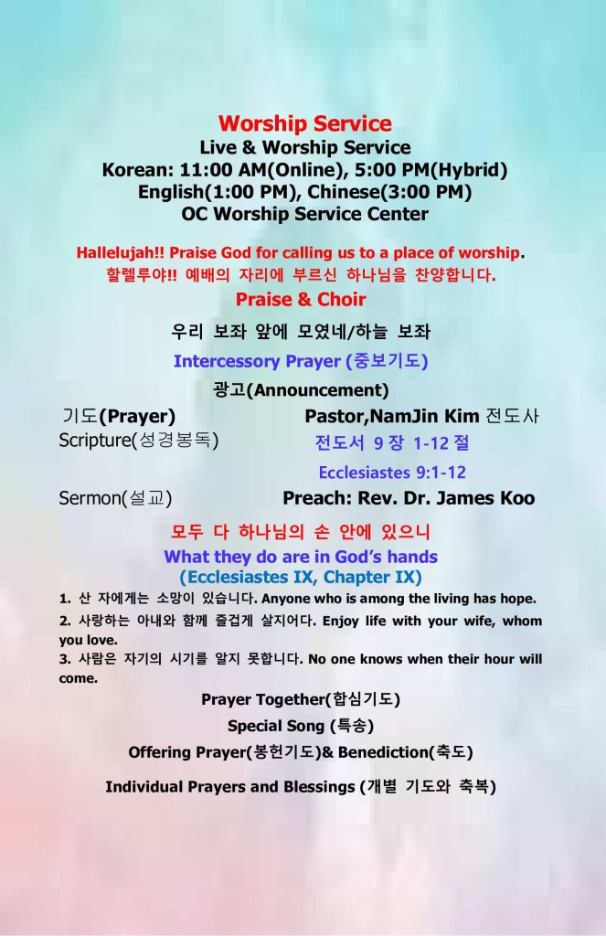 4. Sunday worship services are held at 11:00 AM in Korean, 1:30 PM in English (online platform), and our onsite worship takes place every Sunday at 5:00 PM.