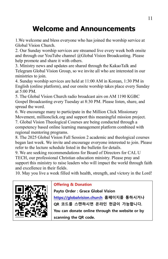 1. 글로벌 비전 교회 예배에 참석하신 모든 분을 환영하고 축복합니다.