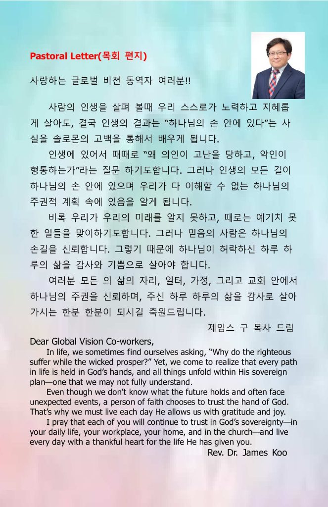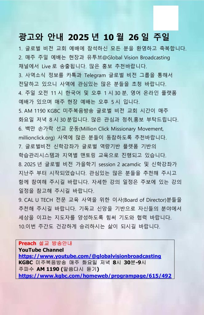 2. 매주 주일 예배는 현장과 유투브@Global Vision Broadcasting 채널에서 Live로 송출됩니다. 많은 홍보 추천바랍니다.