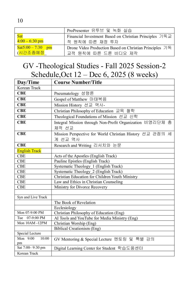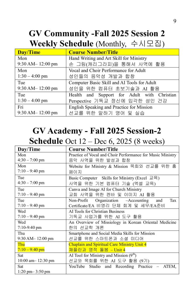 8. 2025년 글로벌 비전 가을학기 session 2 acamdic 및 신학강좌가 지난주 부터 시작되었습니다. 관심있는 많은 분들을 추천해 주시고 함께 참여해 주시길 바랍니다. 자세한 강의 일정은 주보에 있는 강의 일정을 참고해 주시길 바랍니다.