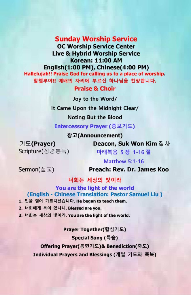 4. 매주일 현장 예배시간이 오전 11시 영어 및 동시 통역예배로 진행됩니다. 또한 다국어 플랫폼 예배도 함께 제공됩니다. 많은 관심과 참여 바랍니다.