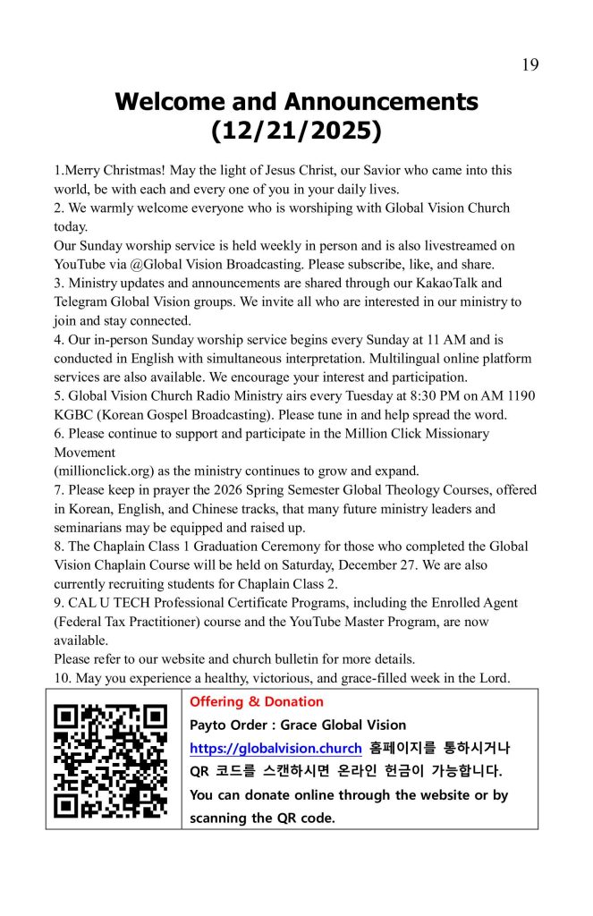2.글로벌 비전 교회 예배에 참석하신 모든 분을 환영합니다. 매주 주일 예배는 현장과 유투브@Global Vision Broadcasting 채널에서 Live로 송출됩니다. 구독 및 좋아요, 많은 추천바랍니다.