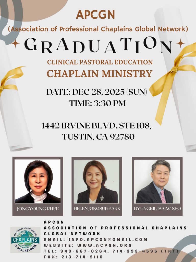 We are pleased to invite you to the CPE(Clinical Pastoral Education) Graduate and Certified Professional Chaplain (CPC) recognition event hosted by the Association of Professional Chaplains Global Network (APCGN). This certification affirms a chaplain’s commitment to spiritual care excellence, professional integrity, and ongoing formation.
