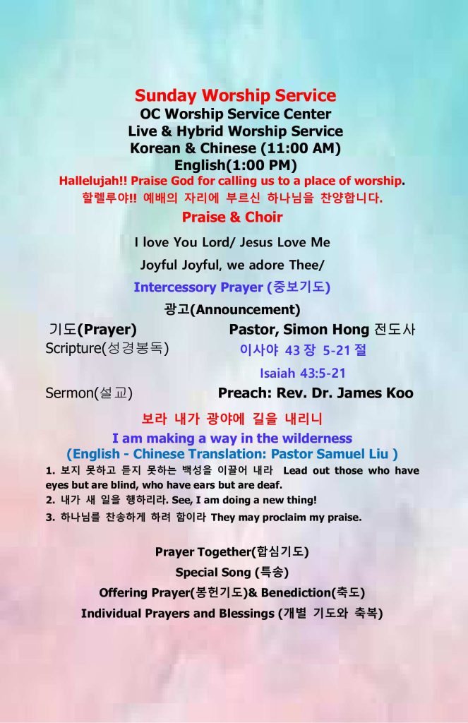 2. Our in-person Sunday worship service begins at 11:00 AM and is conducted in English with simultaneous interpretation. After the service, there will be a time of fellowship, including birthday celebrations. We invite everyone to stay and celebrate together.