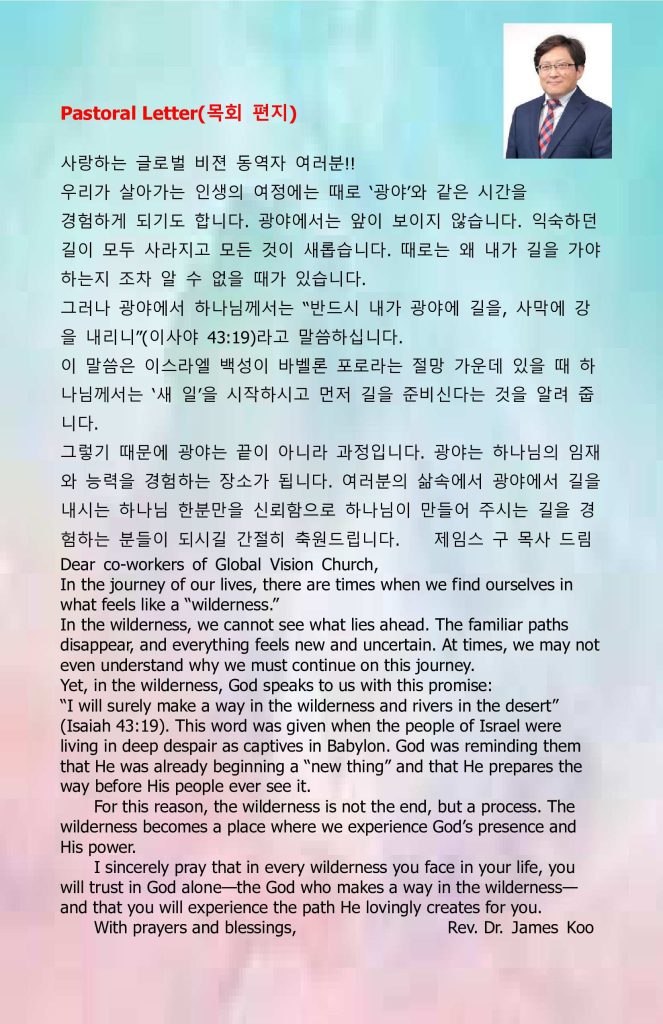3. The Global Vision Church radio program airs on AM 1190 KGBC (Korean Gospel Broadcasting Company) every Tuesday evening at 8:30 PM. We appreciate your listening and help in spreading the word.