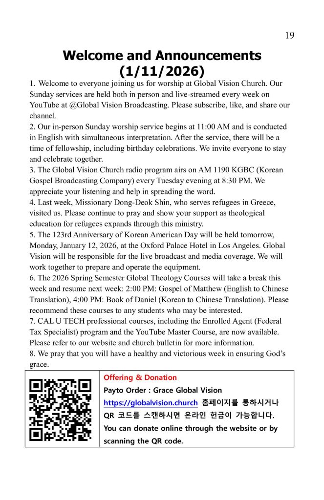 1.글로벌 비전 교회 예배에 참석하신 모든 분을 환영합니다. 매주 주일 예배는 현장과 유투브@Global Vision Broadcasting 채널에서 Live로 송출됩니다. 구독 및 좋아요, 많은 추천바랍니다.