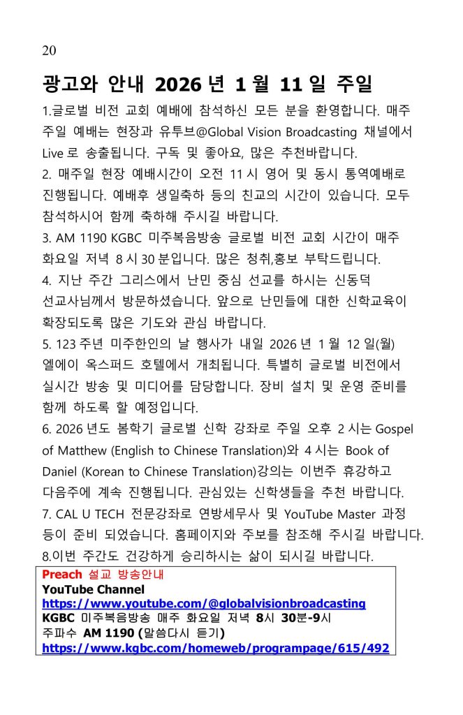 | Preach 설교 방송안내 YouTube Channel https://www.youtube.com/@globalvisionbroadcasting KGBC 미주복음방송 매주 화요일 저녁 8시 30분-9시 주파수 AM 1190 (말씀다시 듣기) https://www.kgbc.com/homeweb/programpage/615/492 |