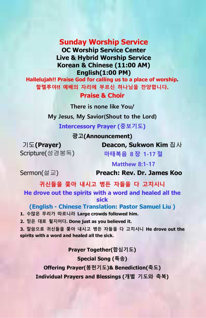 2. 매주일 현장 예배시간이 오전 11시 영어 및 동시 통역예배로 진행됩니다. 예배후 친교의 시간이 있습니다.