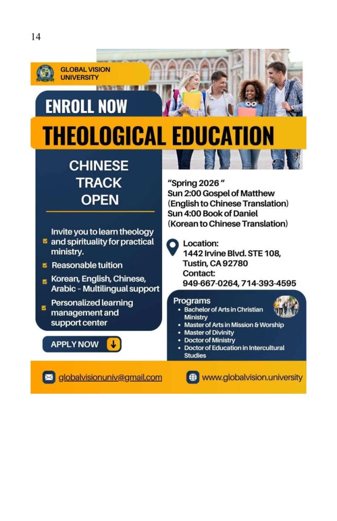 7. Chinese Global Theology courses continue on Sundays: 2:00 PM: Gospel of Matthew (English to Chinese), 4:00 PM: Book of Daniel (Korean to Chinese)