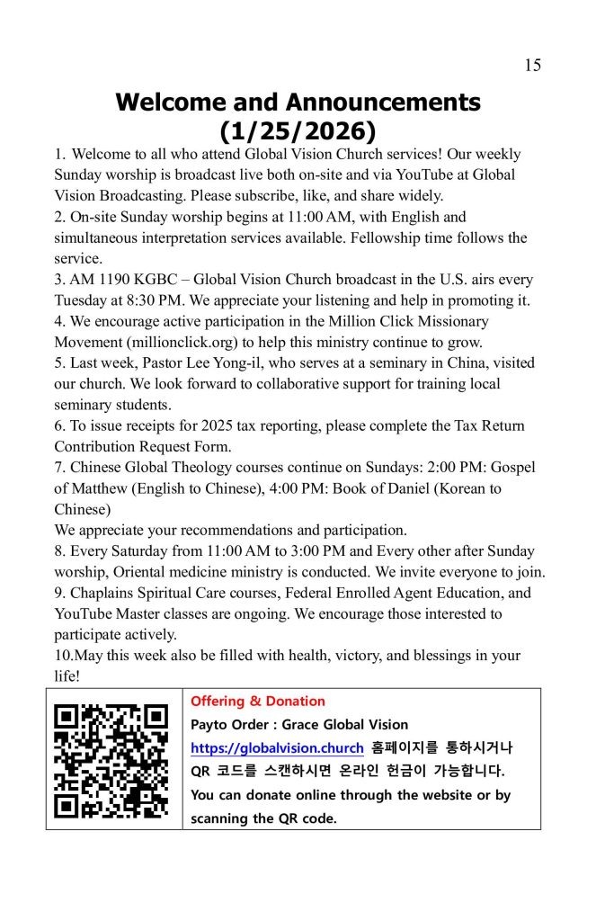 1.글로벌 비전 교회 예배에 참석하신 모든 분을 환영합니다. 매주 주일 예배는 현장과 유투브@Global Vision Broadcasting 채널에서 Live로 송출됩니다. 구독 및 좋아요, 많은 추천바랍니다.