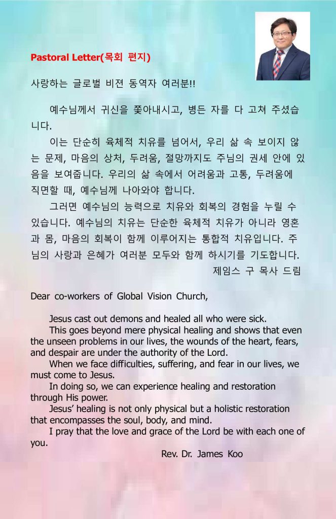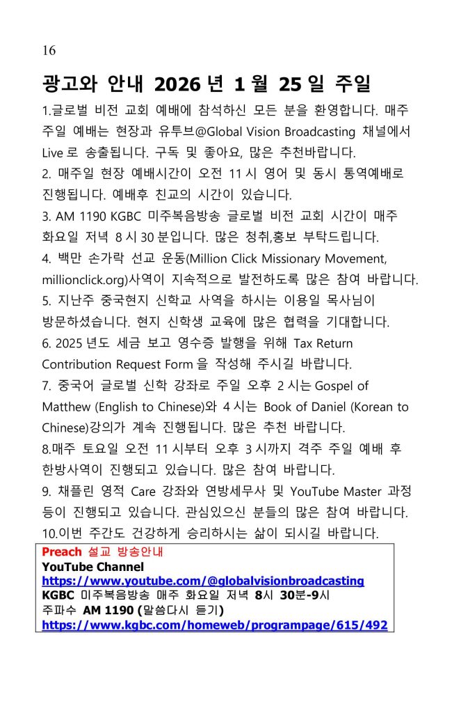 | Preach 설교 방송안내 YouTube Channel https://www.youtube.com/@globalvisionbroadcasting KGBC 미주복음방송 매주 화요일 저녁 8시 30분-9시 주파수 AM 1190 (말씀다시 듣기) https://www.kgbc.com/homeweb/programpage/615/492 |